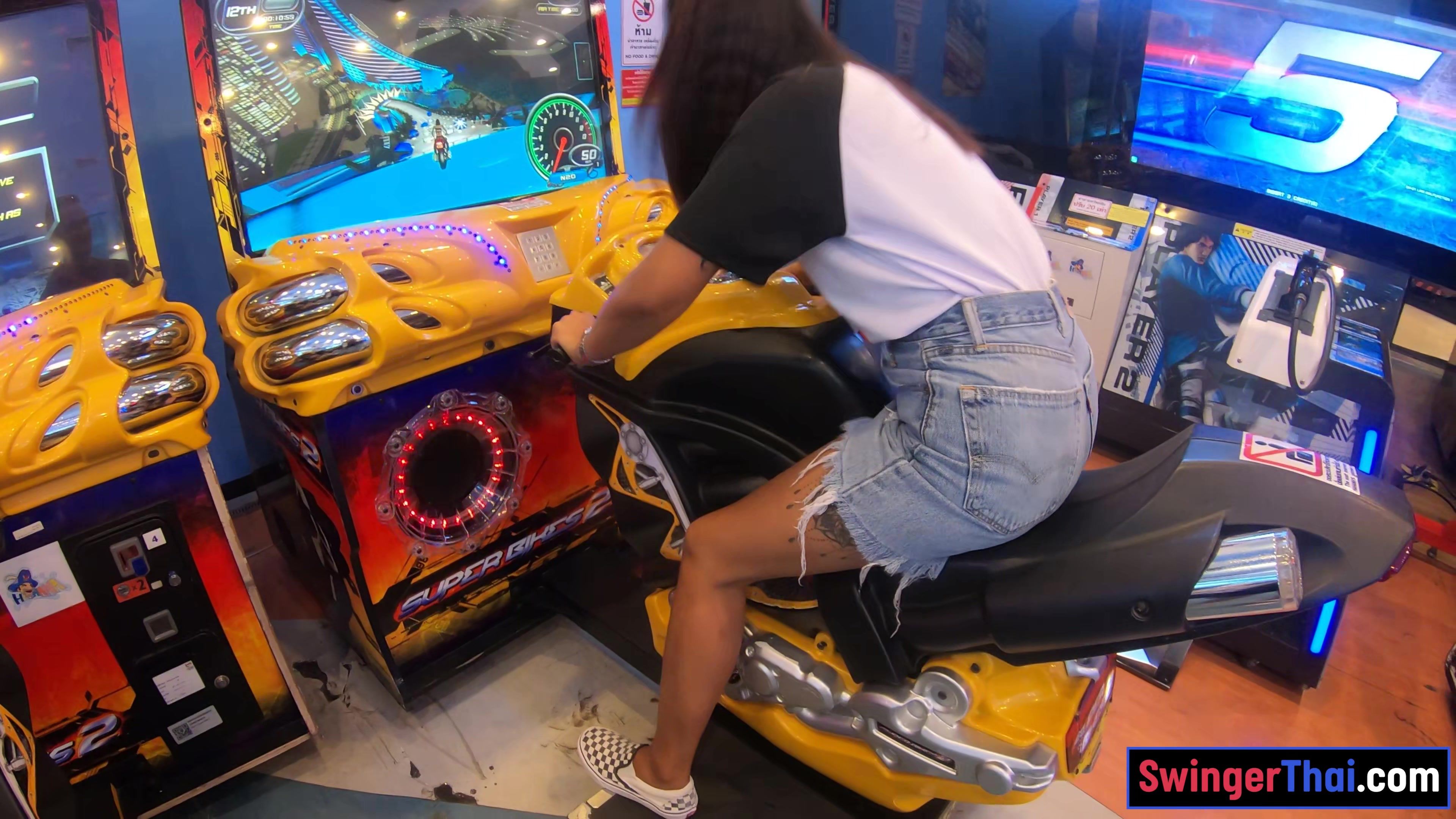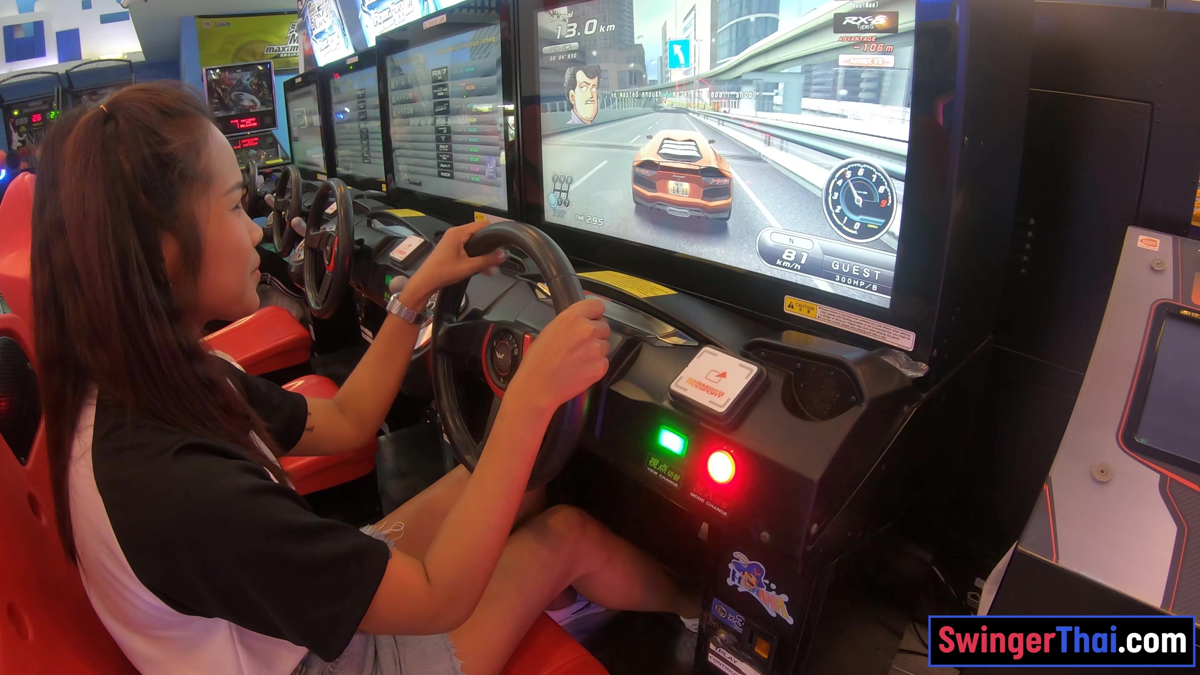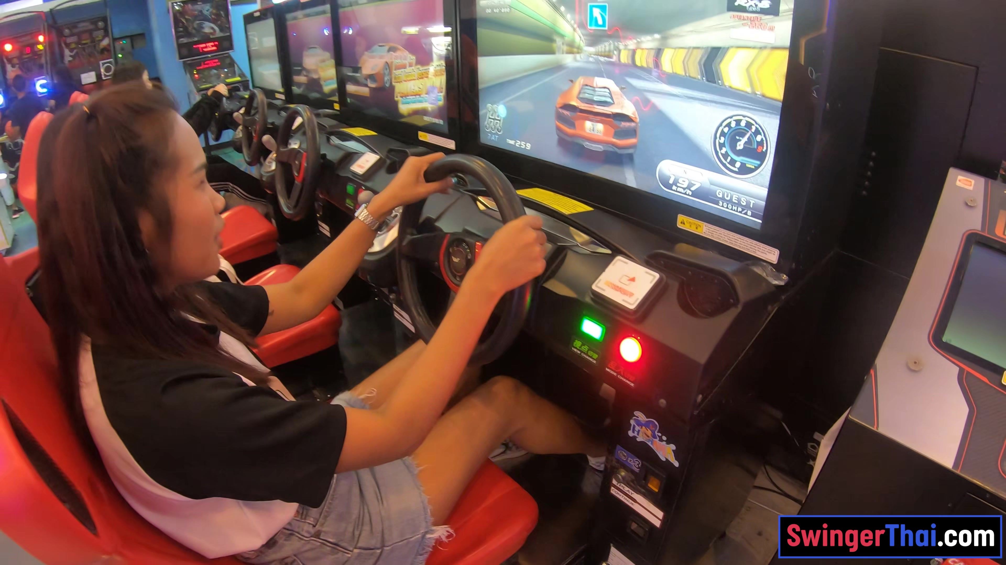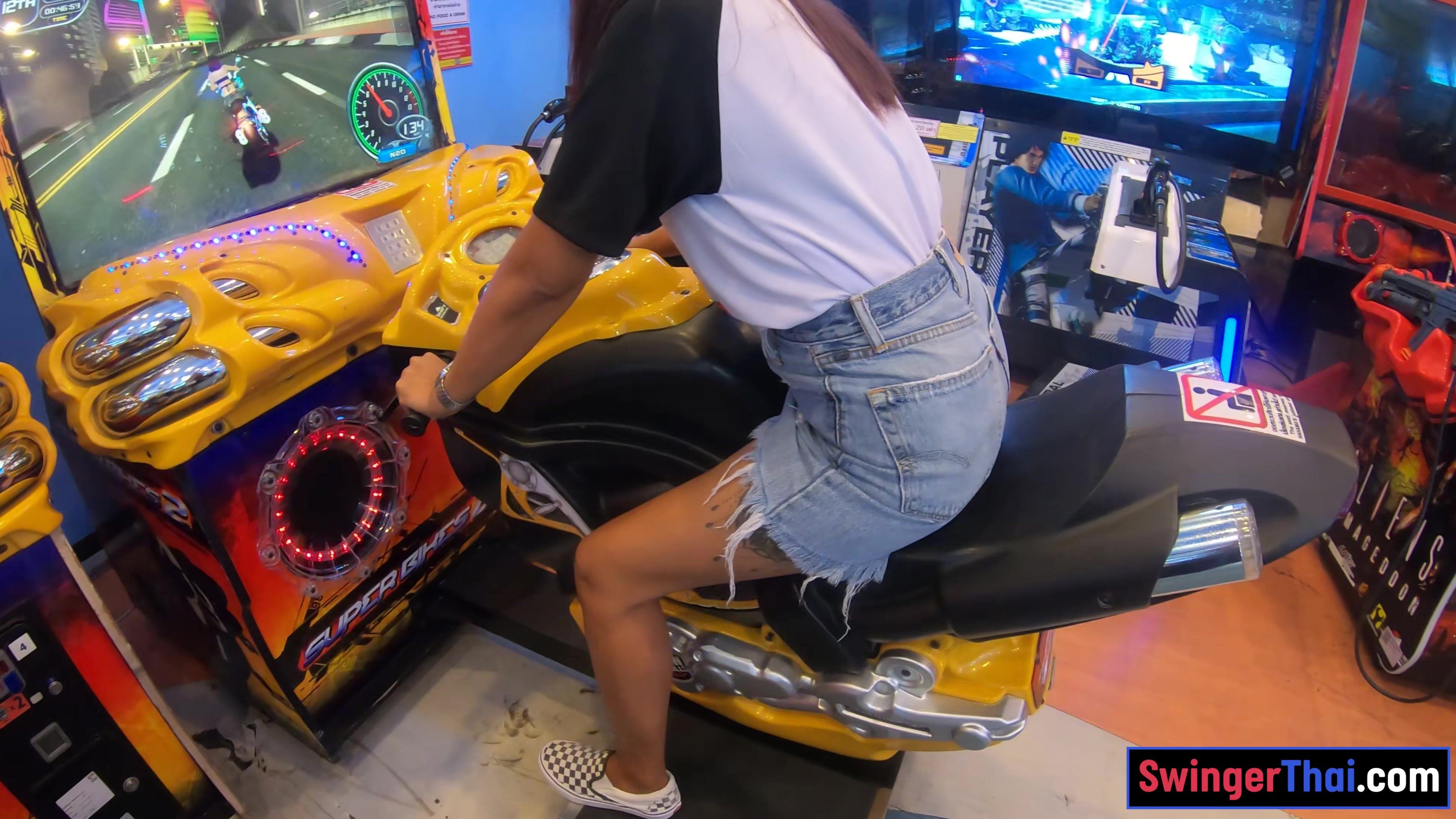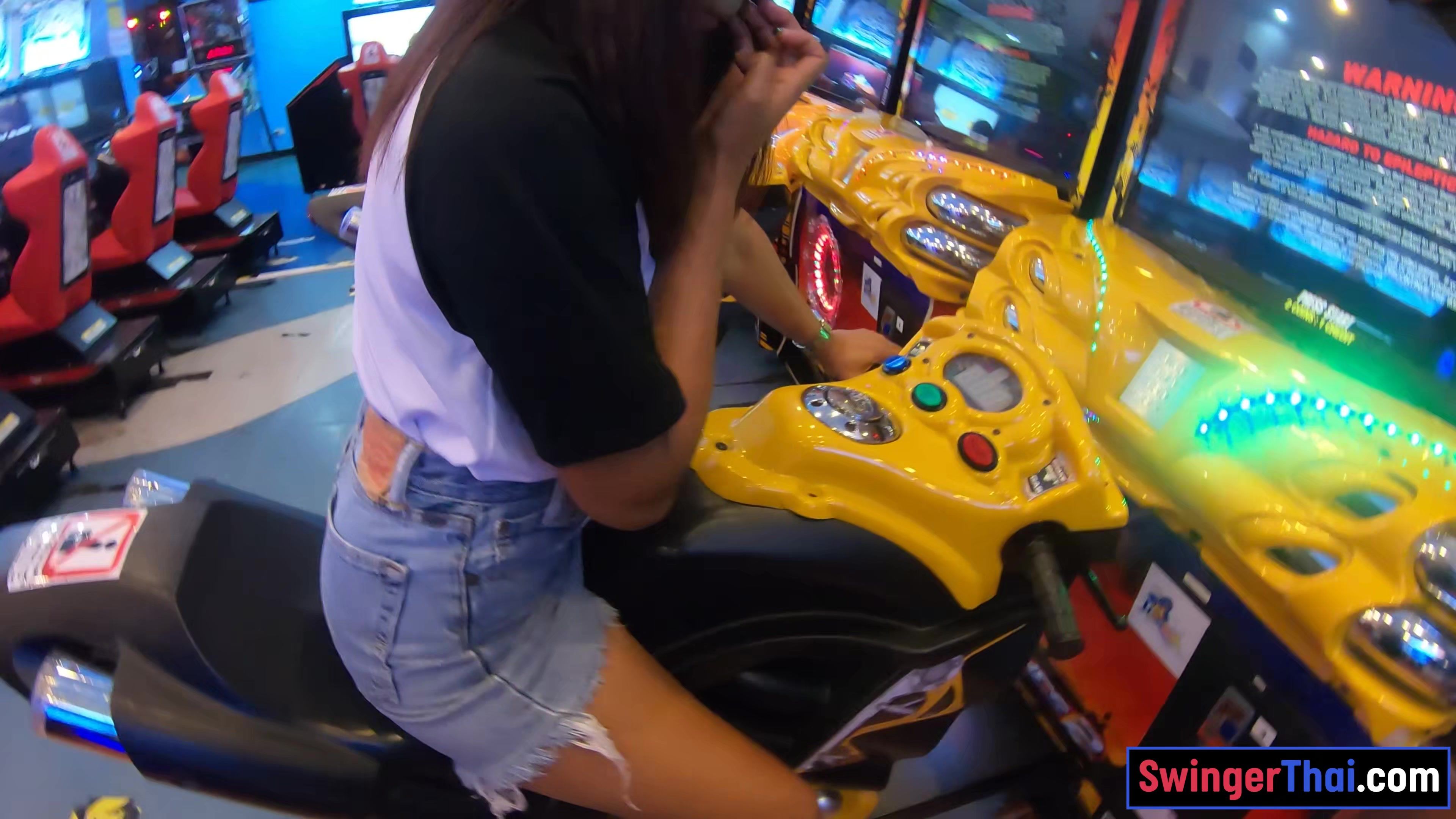 Young Thai MILF girlfriend jerks her boyfriends big white cock after a day out in the mall where she played some games while he watched her having fun at them! Once home he pulled his big dick out for her and she gave him a horny handjob!